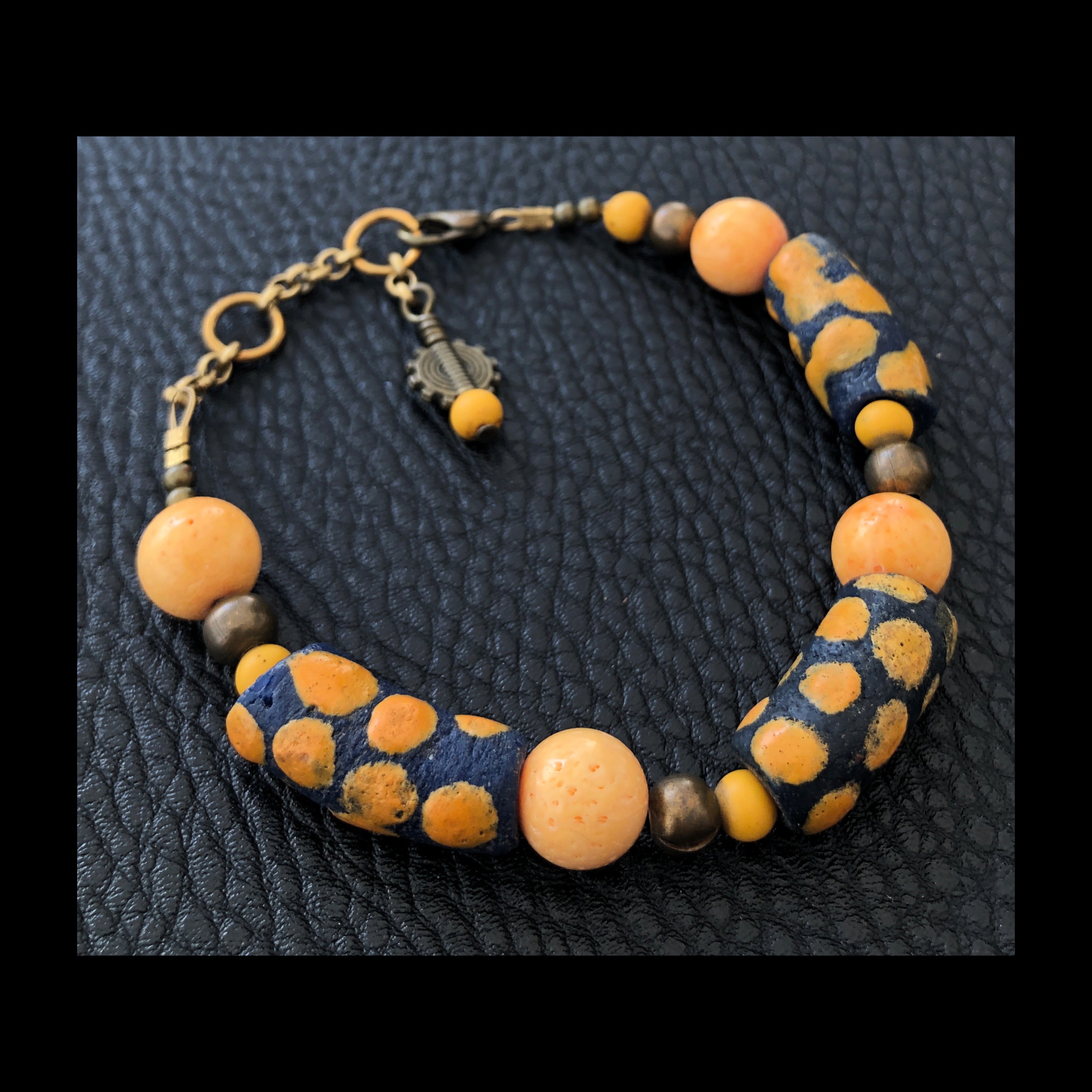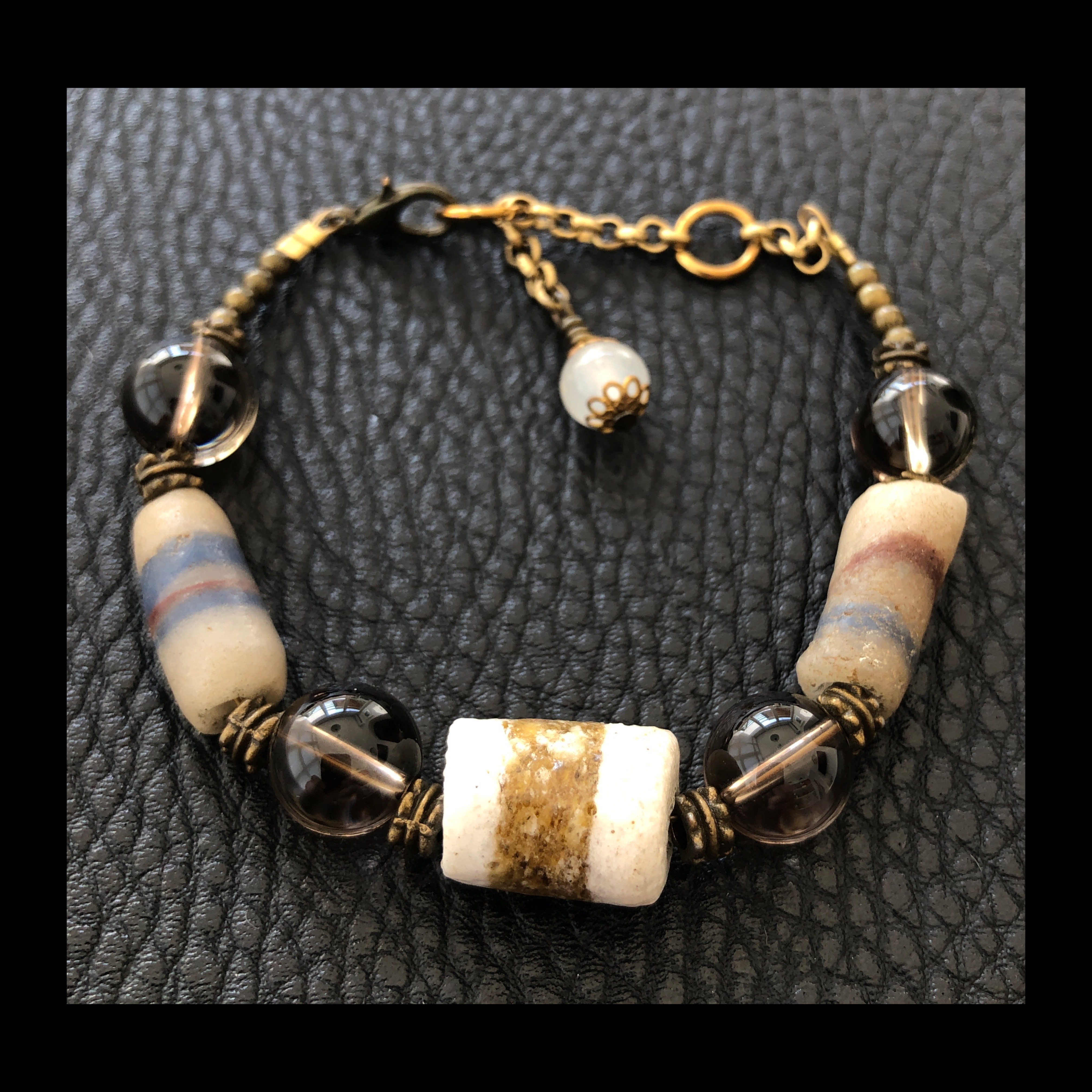 Scopri l'eleganza naturale di questo bracciale. Una creazione che combina l'intensità dei quarzi fumèe, la ricchezza delle paste di vetro africane e il fascino rustico dell'ottone brunito. Un modello che cattura lo sguardo con le sue sfumature terrose e calde evocando la bellezza dei paesaggi naturali. Ogni elemento è sapientemente lavorato per creare un'armonia perfetta tra i materiali. Misura regolabile. Pezzo unico by Giuliana Santin. Se desideri acquistare o avere altre info scrivimi, sarò lieta di aiutarti.