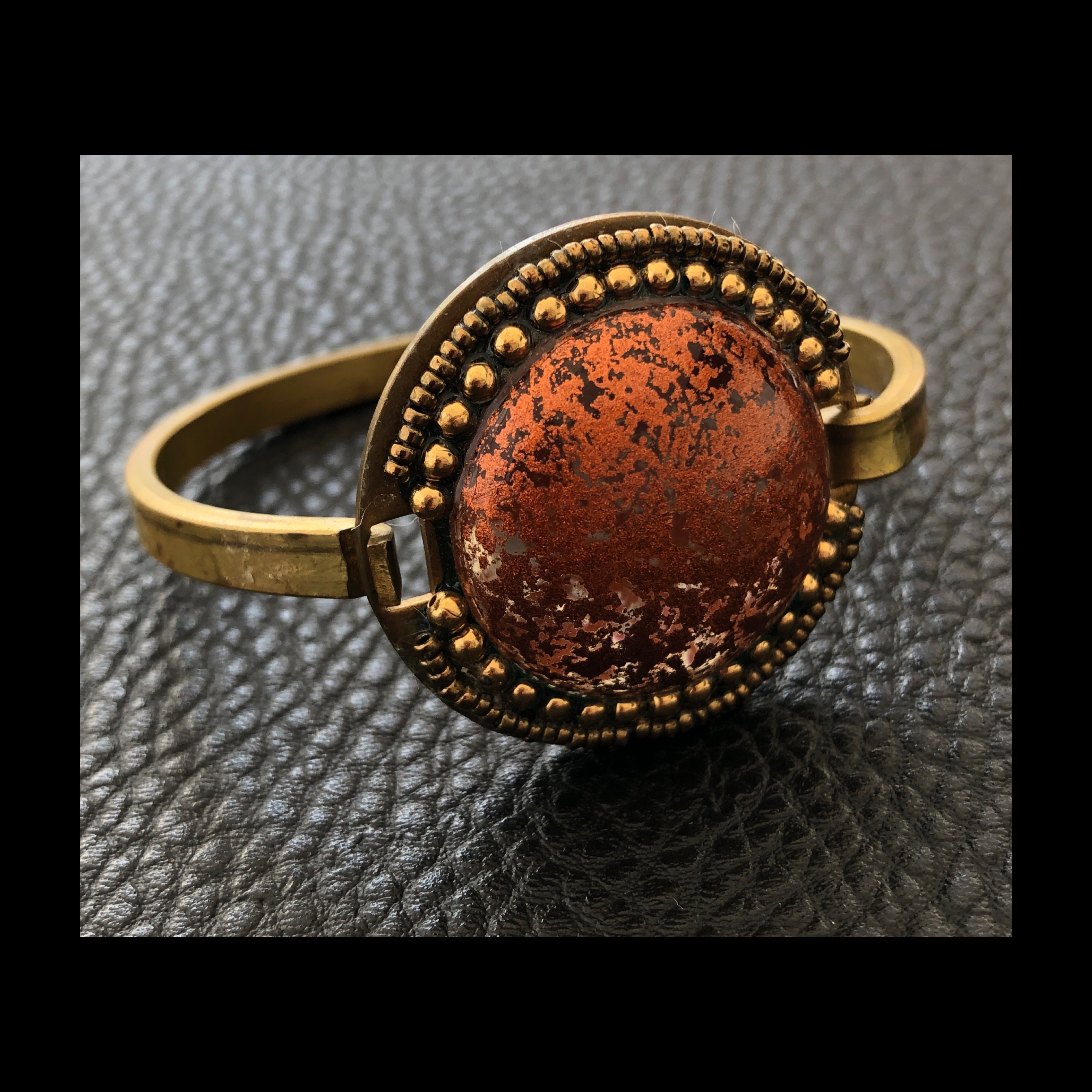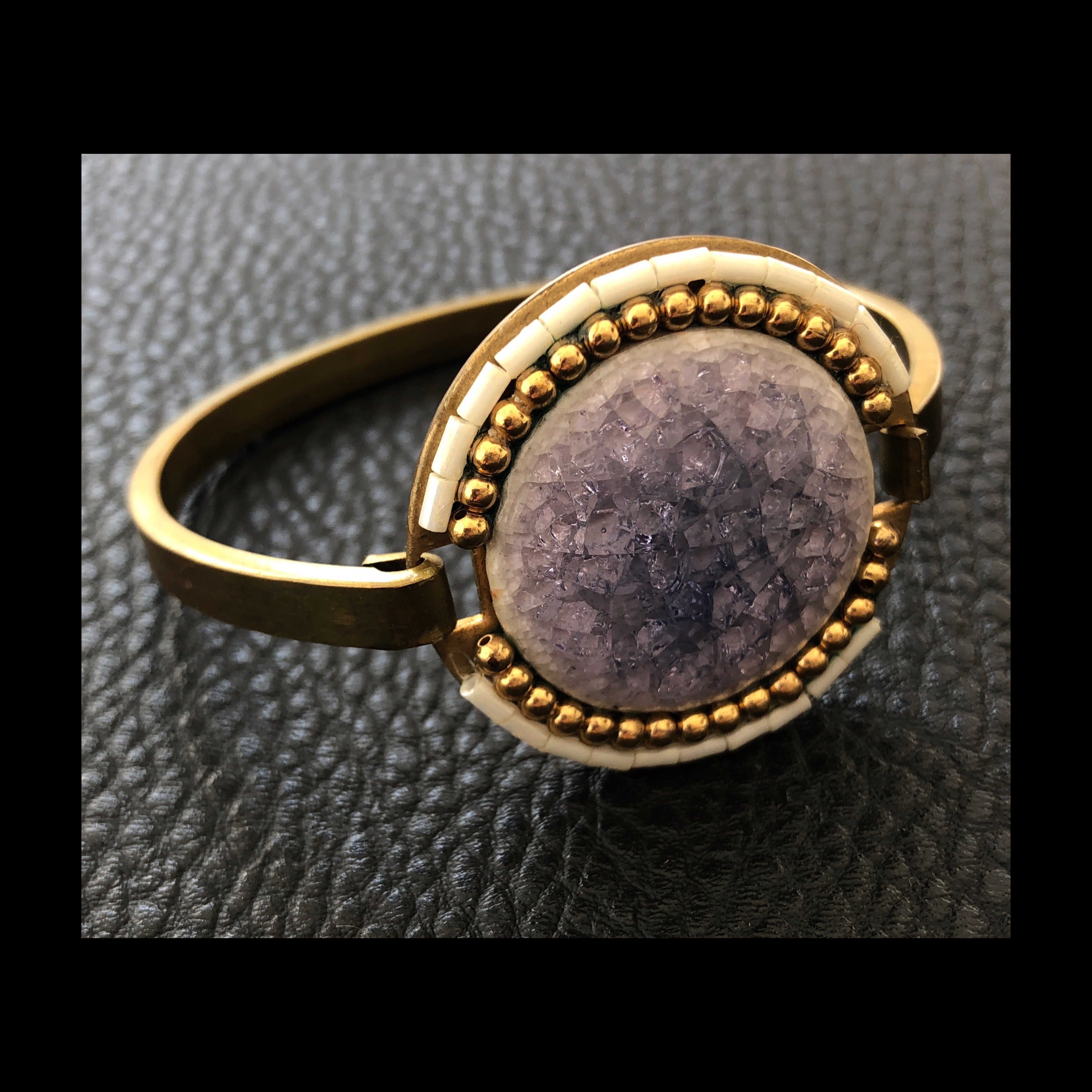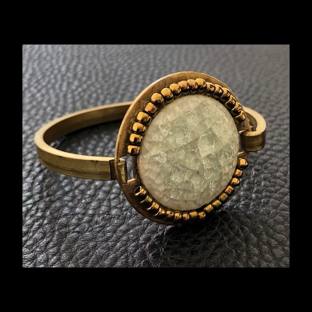 Bracciale in ottone, modello a manetta con centrale in vetro. Pezzo unico by Giuliana Santin. Se desideri acquistare o avere altre info scrivimi, sarò lieta di aiutarti.