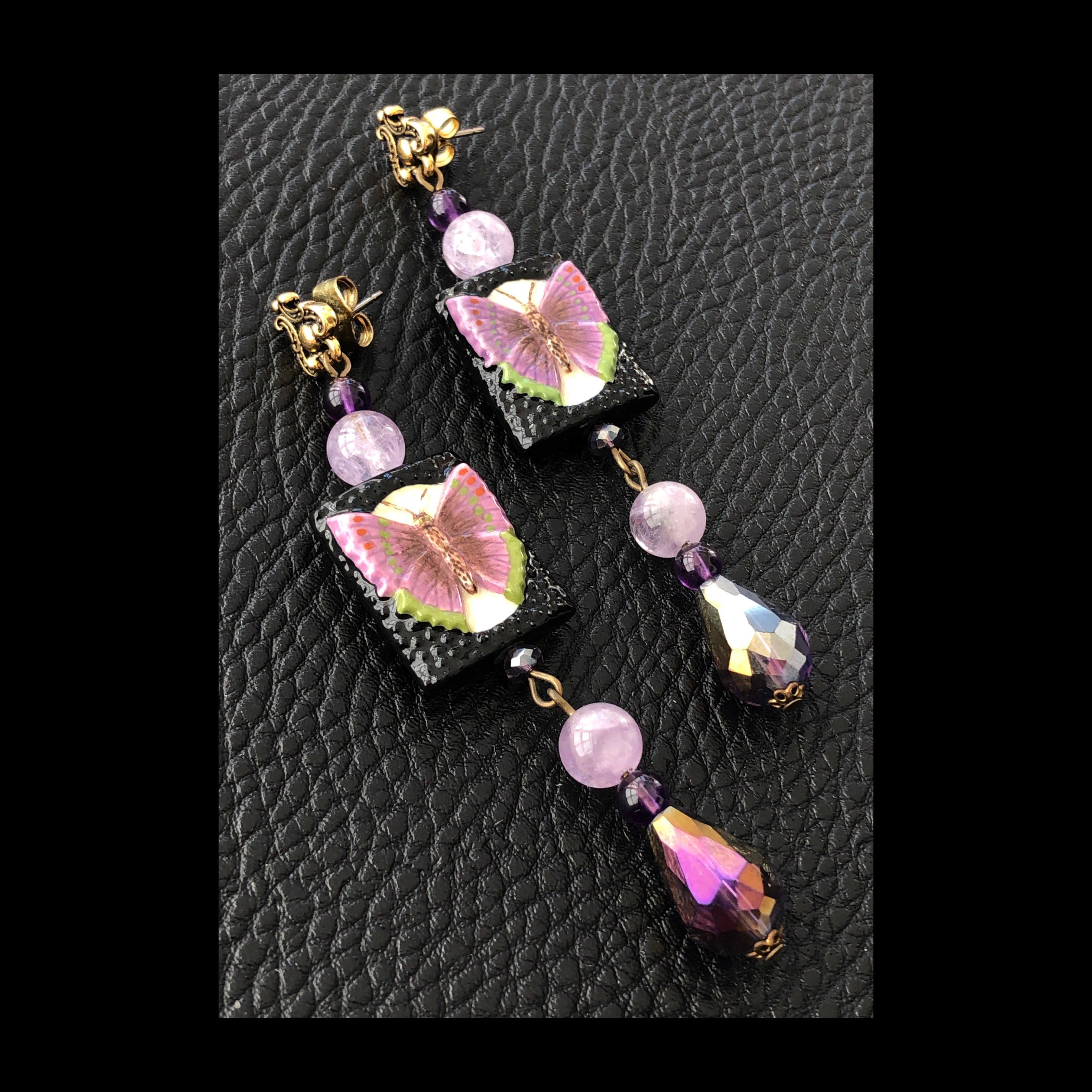 Orecchini realizzati con bellissime porcellane con decori a farfalle, ametiste lilla e viola e cristalli di Boemia. Pezzo unico by Giuliana Santin. Se desideri acquistare o avere altre info scrivimi, sarò lieta di aiutarti.