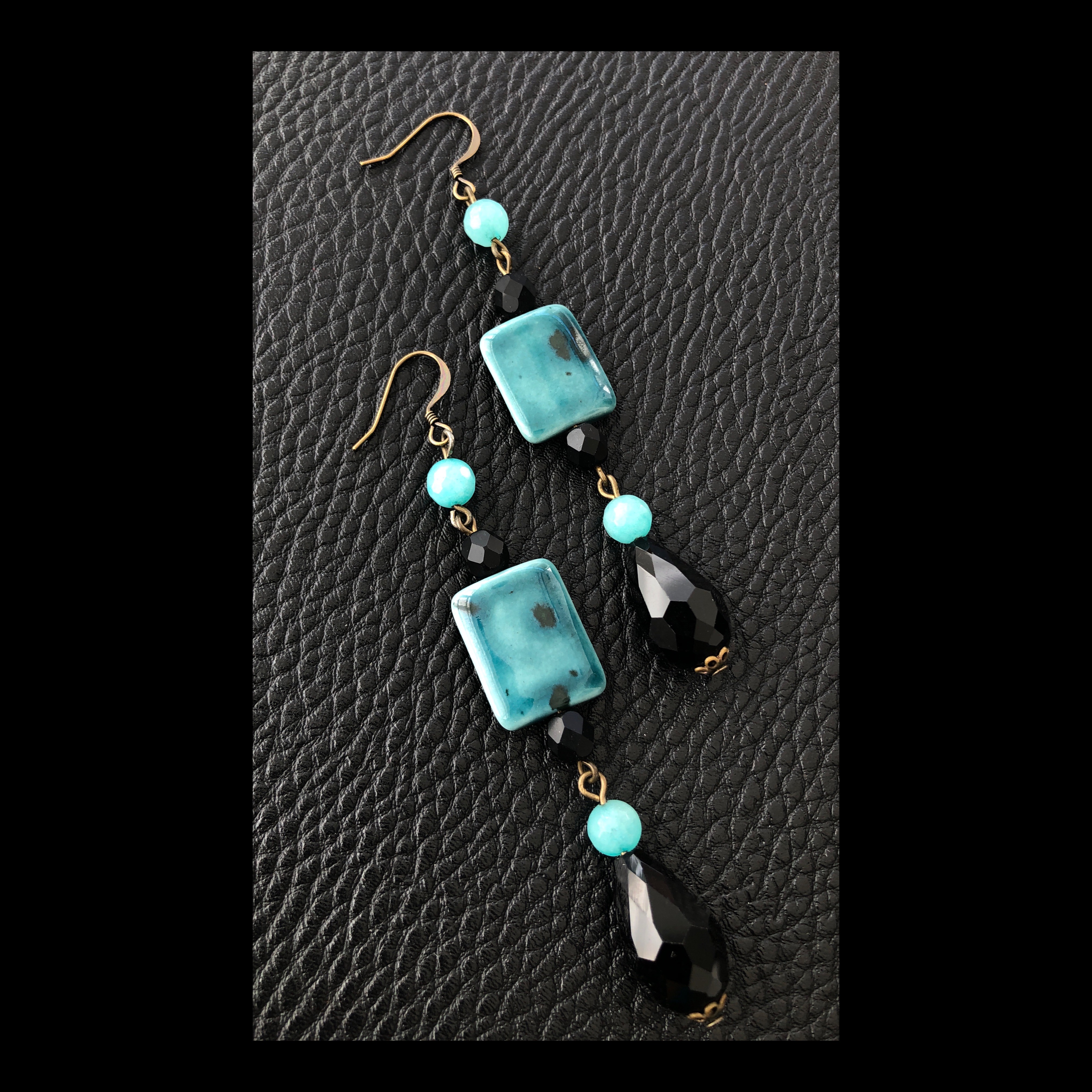 Orecchini realizzati con porcellane di forma rettangolare dipinte in blu petrolio e nero, agate e cristalli di Boemia. Pezzo unico by Giuliana Santin. Se desideri acquistare o avere altre info scrivimi, sarò lieta di aiutarti.