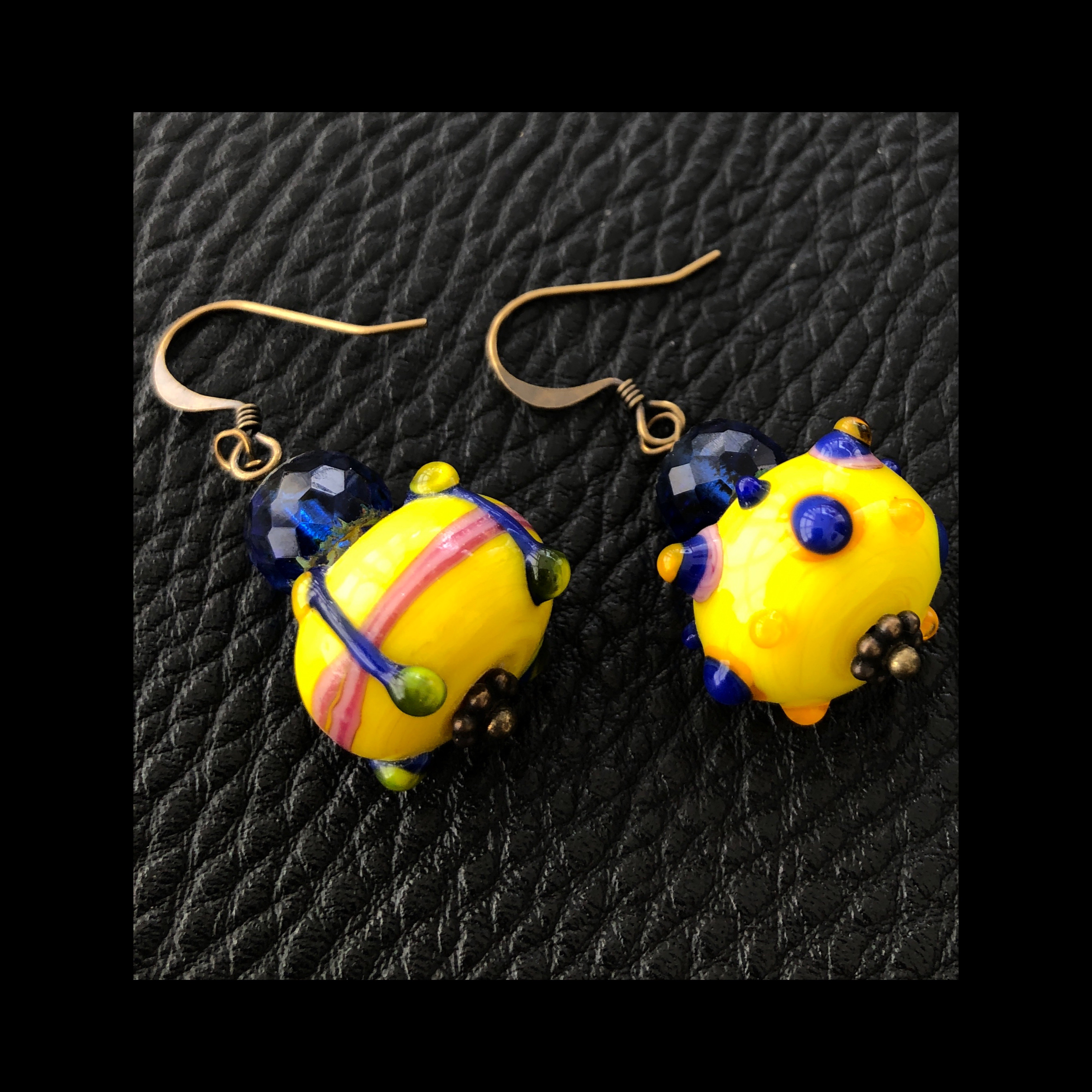 Orecchini realizzati con vetri Lampwork, onice blu e rondelle in ceramica. Pezzo unico by Giuliana Santin. Se desideri acquistare o avere altre info scrivimi, sarò lieta di aiutarti.
