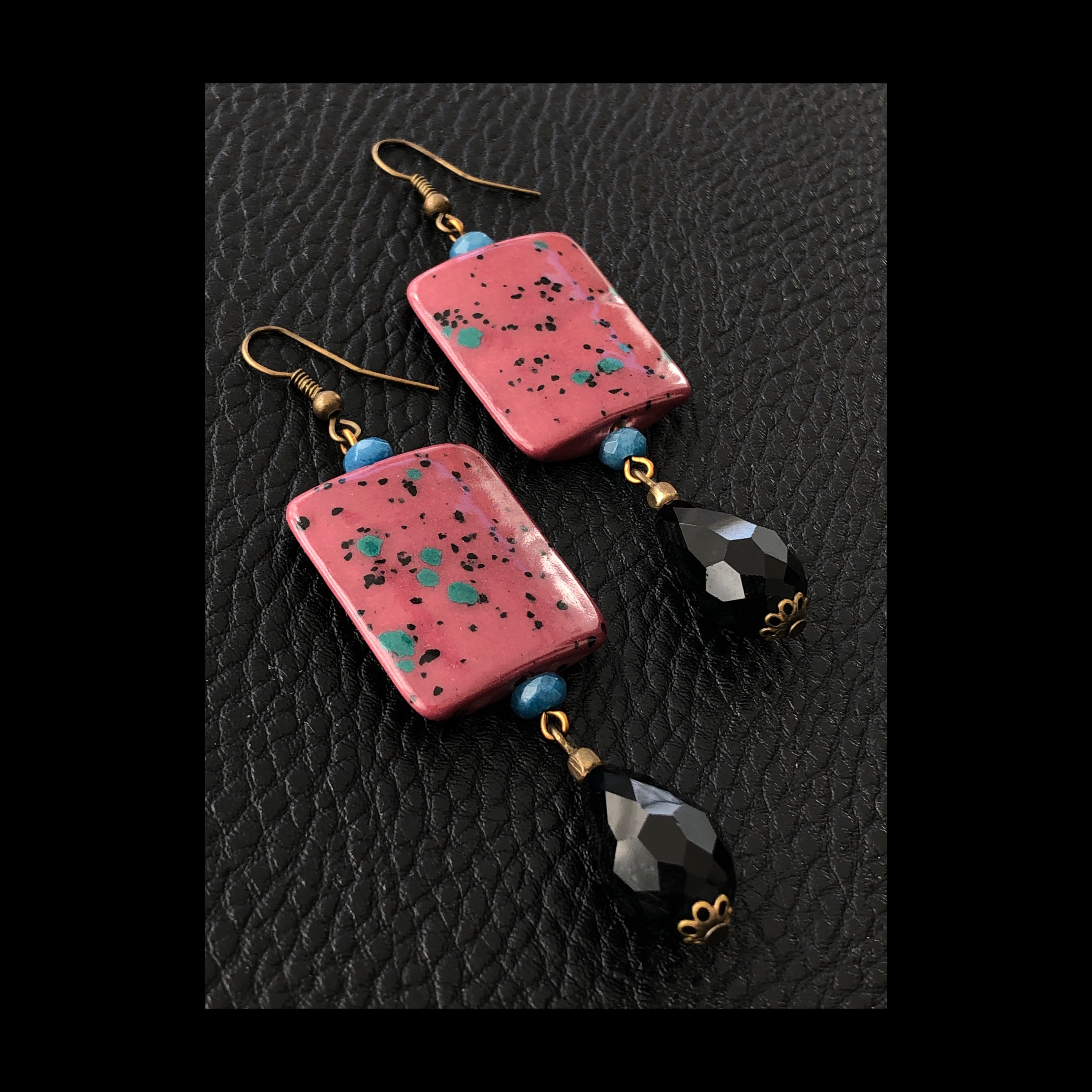 Orecchini realizzati con porcellane rettangolari dipinte in una particolare sfumatura di rosa con screziature azzurre, cristalli di Boemia a goccia neri e rondelle di pasta di vetro africana. Pezzo unico by Giuliana Santin. Se desideri acquistare o avere altre info scrivimi, sarò lieta di aiutarti.